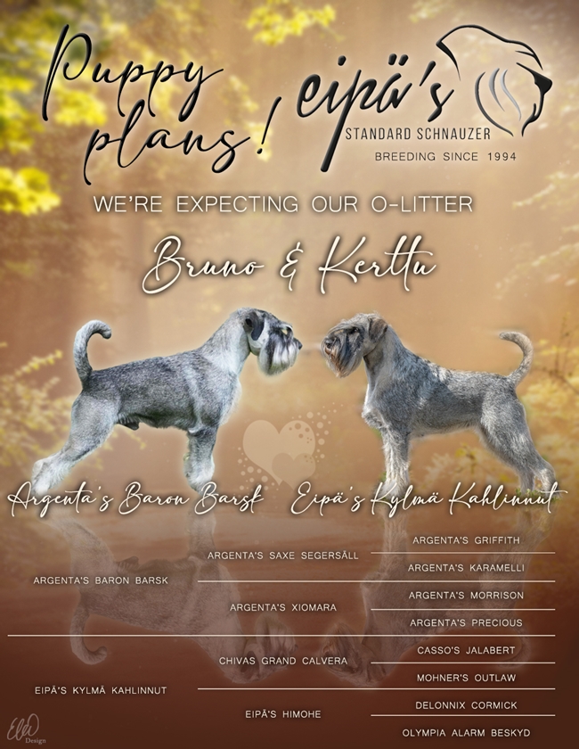 | Kiinnostuitko Eipä's pennusta? Klikkaa tänne. Lisätietoja ja yhteydenotot Paula Herrala +358 400 589 477 tai Eila Kettunen +358 505 972 920 tai eipaskennel @ gmail.com. Please, more information and contact us by e-mail. eipaskennel @ gmail.com |