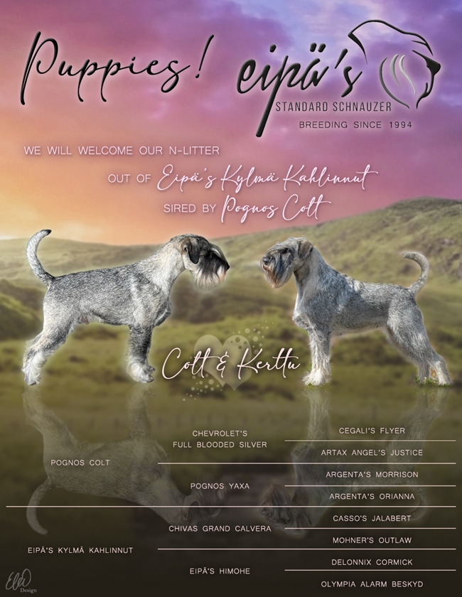 Pentu-uutisia Eipä's Kylmä Kahlinnut, Kerttu, on ultrattu positiivisin tuloksin Pentuja odotetaan syntyväksi viikolla 15, huhtikuun puolivälin tienoilla. Yhteydenotot Paula Herrala +358 400 589 477 tai Eila Kettunen + 358 505 972 920 tai eipaskennel @ gmail.com. ![]() |