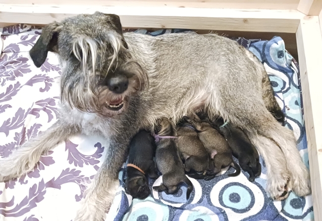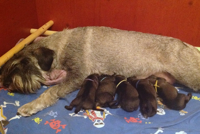 N-pentue on syntynyt, Kertun ja Coltin pennut ovat syntyneet, viisi potraa poikaa tuhisee laatikossa. Yksi pojista vielä kotia vailla! Katso pentuja sivulta yhteystietoja. ![]() Kerttu ja pojat Kuva Paula Herrala |